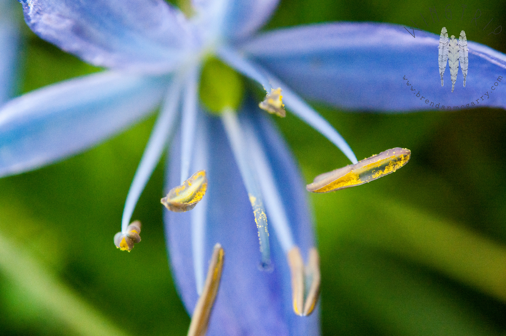 Stamen are the male portion of a flower. Many flowers are hermaphroditic, bearing both male and female parts, but some only carry one or the other. This Common Camas (Camassia quamash) flower has both and is considered a “complete flower.” Stamens consist of a filament, the stalk, on the end of which dangles the anther (prominent in this image). Pollen production happens on the anther, intended to drift off, on a pollinating animal or simply in the wind, to fertilize another flower nearby. Collectively the stamens of a flower are called the androecium, which is a big word I don’t expect anyone to be using in everyday discussions of plants. But from now on, you have to say stamen instead of “those pollen thingies.” We’ve still got plenty of summer to enjoy some flowers, you might as well learn a bit about them.